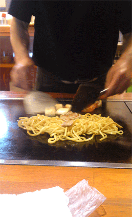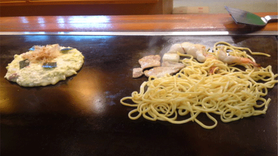 このお店は、たぶん、鉄板のゾーンで焼く人のテリトリーが決まってるんだと思います。